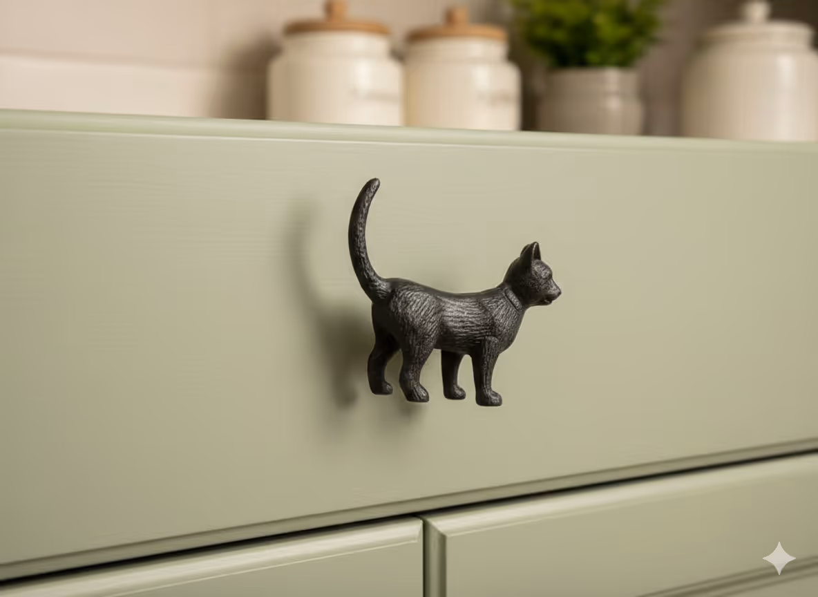 The Tŷ Du Cat Cabinet Knob is a small detail with a big personality. Cast from solid iron and finished in a warm antique iron tone, this knob brings a subtle sense of charm and storytelling to cupboards, drawers, and furniture throughout the home.